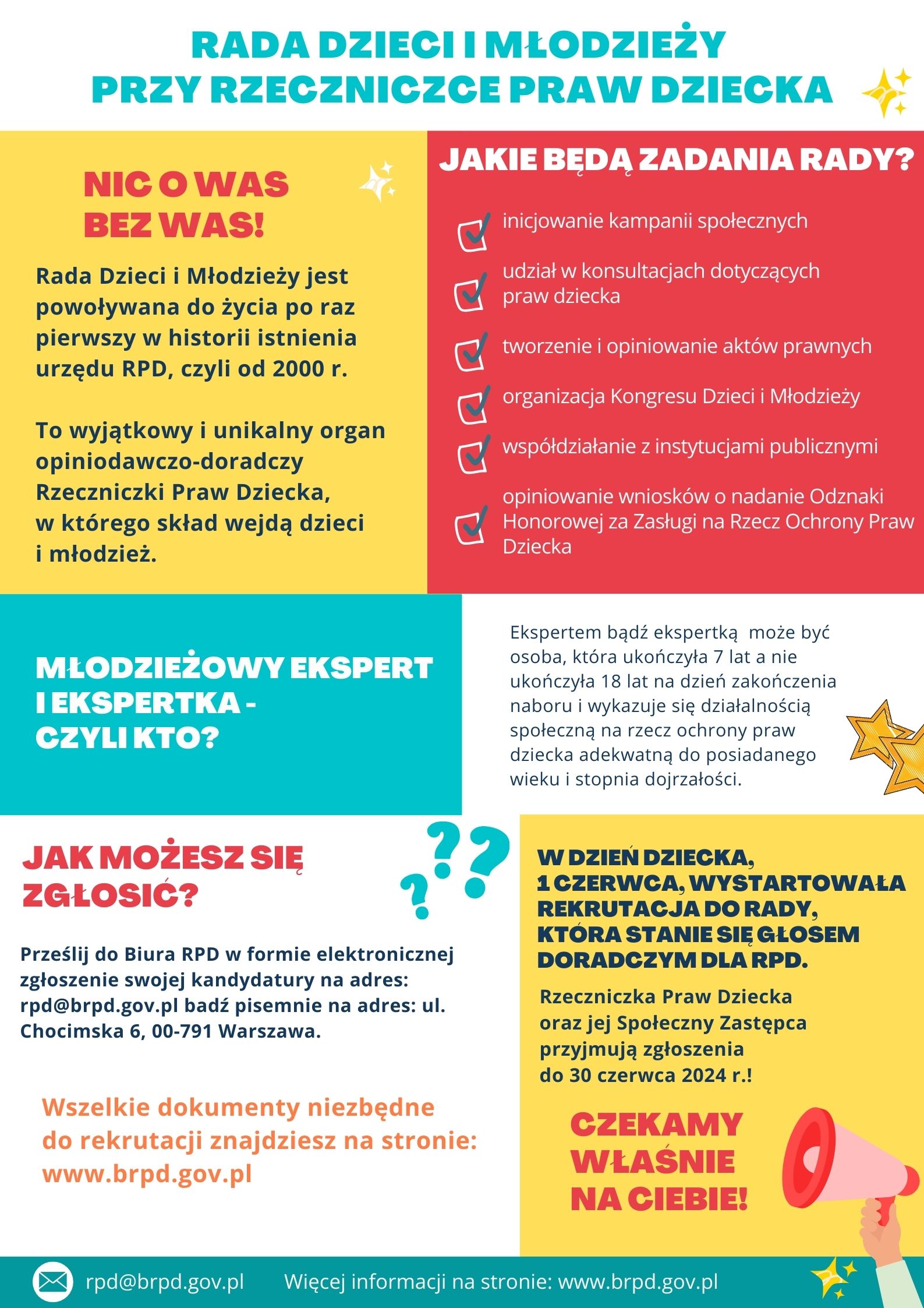 Zgłoszenie do Rady Dzieci i Młodz należy wysłać do Biura Rzecznika Praw Dziecka w formie elektronicznej na adres: rpd@brpd.gov.pl bądź pisemnie na adres: ul. Chocimska 6, 00-791 Warszawa.