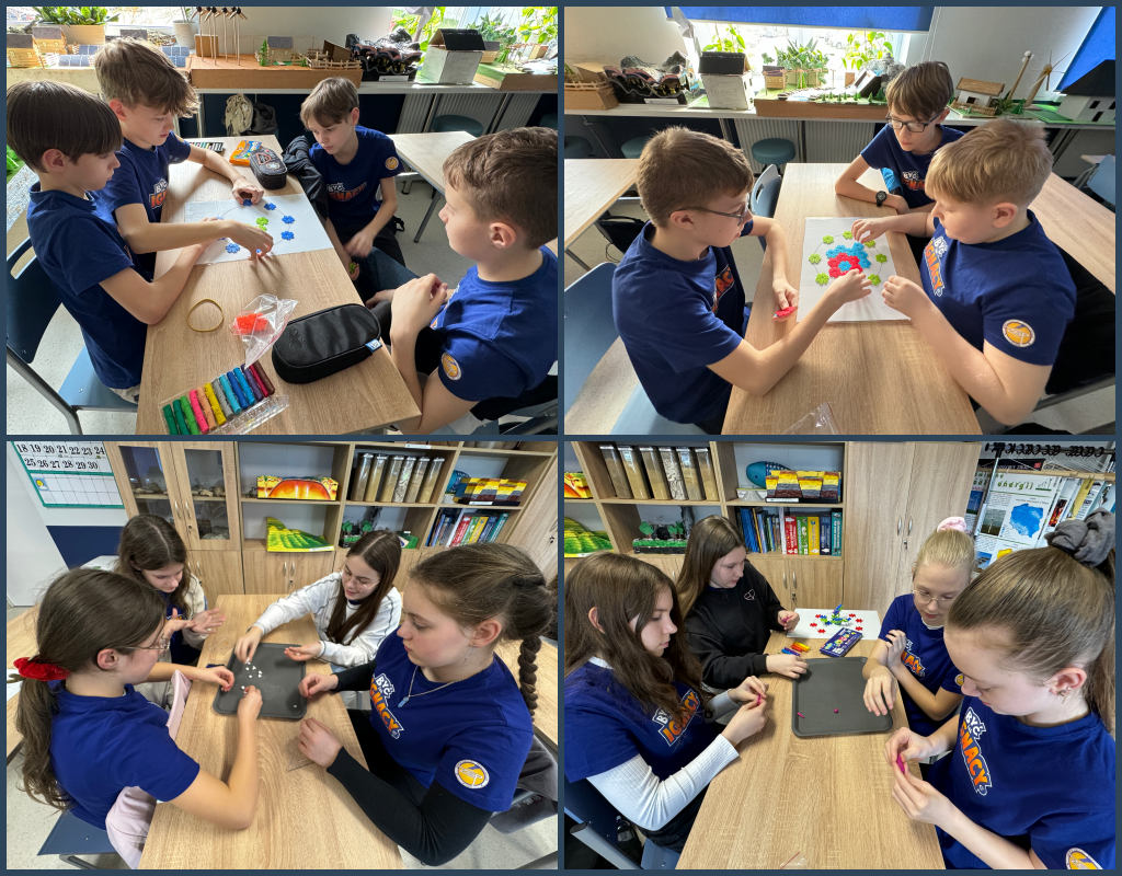 Młodzi Odkrywcy zgłębiali wiedzę na temat działania elektrowni jądrowej. Na początku poznali budowę atomu. Następnie, wykorzystując kolorowe klocki, wykonali model atomu tlenu. Uczniowie dowiedzieli się, dlaczego niektóre pierwiastki np. uran wykorzystywane są w elektrowniach atomowych. Kulki z plasteliny posłużyły im do zobrazowania reakcji łańcuchowej, podczas której dochodzi do rozszczepienia jądra atomu i wydzielenia dużej ilości energii. W kolejnym zadaniu zbudowali model elektrowni jądrowej. Podsumowaniem zajęć było podanie argumentów „za” i „przeciw” budowie elektrowni atomowej oraz wskazanie jej zalet i wad.